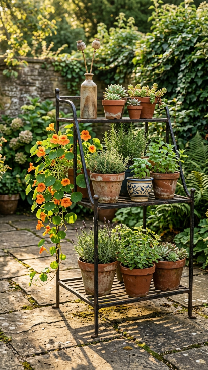 What makes it work: Iron’s dark tonal presence creates dramatic contrast against both soft plant colors and warm stone or brick backdrops — it recedes visually while anchoring the composition. The tiered structure introduces vertical dimension to a patio corner without any wall fixing, and the varying shelf depths allow pot sizes to vary naturally, creating the layered look that characterizes well-styled rustic gardens.