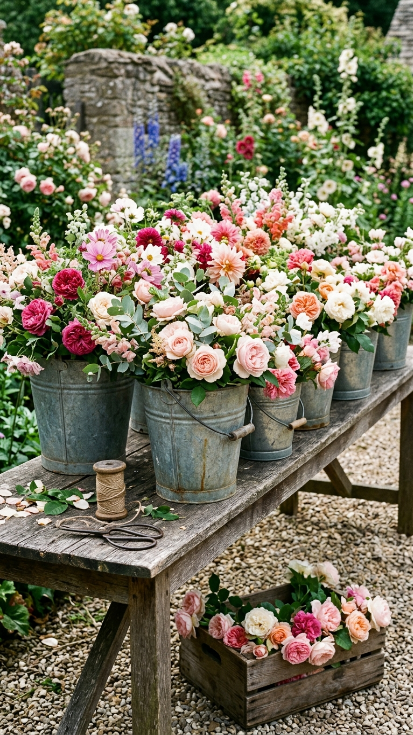 How to achieve it: Source galvanized buckets from agricultural suppliers or hardware stores — they cost $5–15 each and are far cheaper than purpose-sold “rustic flower buckets” from home decor stores. Fill with a mix of structural stems (eucalyptus, rosemary), focal flowers (garden roses, zinnias), and filler (alchemilla, chamomile). Arrange informally — avoid symmetry, allow some stems to lean dramatically for a natural, garden-gathered feel.