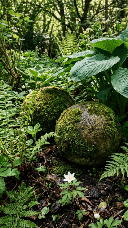 Vibe sentence: A moss-covered stone sphere half-hidden in a shaded border carries the particular magic of something that the garden has slowly, quietly claimed for itself.