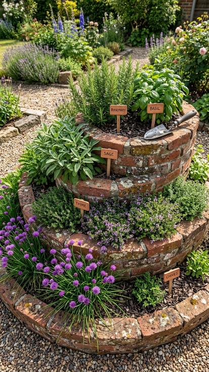 What makes it work: The spiral structure creates multiple microclimates in a remarkably small footprint — the top (warmest and driest) suits Mediterranean herbs like rosemary and thyme, while the lower, shadier positions suit moisture-loving herbs like mint and chives. Reclaimed brick carries inherent textural character that amplifies the rustic quality enormously — aged red brick with its lichen patches and mortar variation beats any new material for this application.