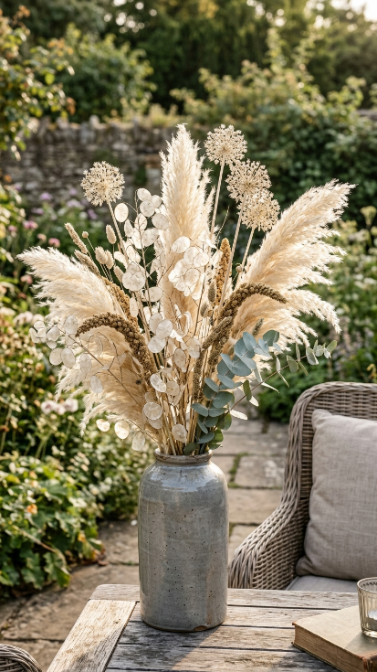 What makes it work: Dried botanicals work outdoors in sheltered positions because they introduce height, movement, and sculptural presence without requiring any water or maintenance. The combination of airy pampas plumes (light and soft), structural allium spheres (geometric and bold), and delicate lunaria discs (translucent and refined) creates three distinct textural registers in a single arrangement that remains visually interesting regardless of viewing angle.