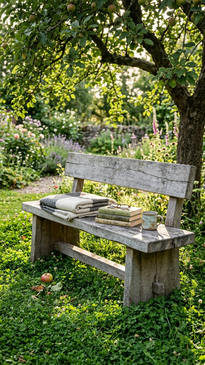 What makes it work: Placement beneath a mature tree creates a natural canopy and a sense of enclosure that transforms a bench from furniture into a destination. The silver-grey weathering of solid oak or teak is one of the most refined finishes in all of outdoor design — it achieves patina that costs nothing and looks better every year. The accessories (a folded blanket, a book, a mug) complete the scene and give it the lived-in quality that defines rustic authenticity.