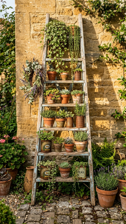 How to achieve it: Source old wooden ladders from estate sales, barn clearances, or antique markets — faded paint in almost any color works beautifully against stone or brick. Secure the top rung to a wall hook to prevent tipping, and ensure the back feet rest on a stable, level surface. Place heaviest pots on the lower rungs to keep the center of gravity low.