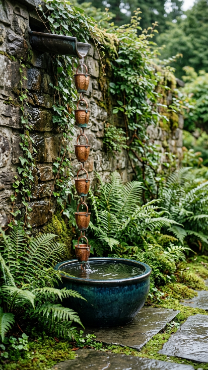 What makes it work: The rain chain introduces an unexpected artisan detail that guests always notice and comment on. Copper’s warm tone against stone or brick is inherently beautiful, and the verdigris patina that develops over months creates a blue-green detail that feels deliberately decorative. Paired with a large ceramic catchment bowl at the base, the whole installation functions as both practical drainage and water feature simultaneously.