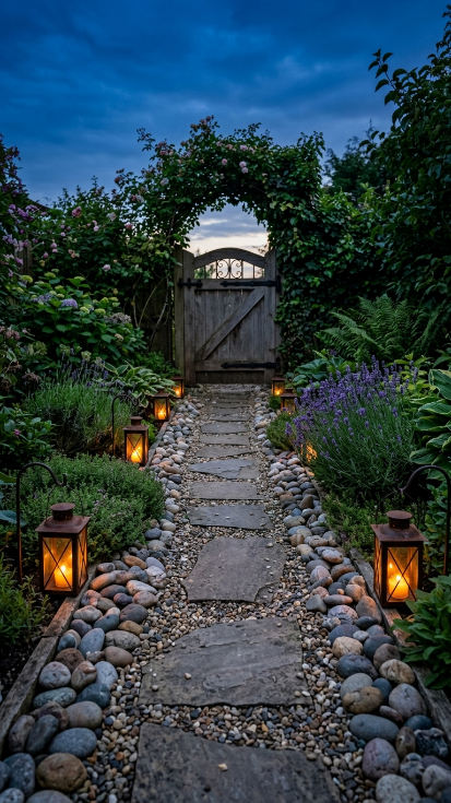 Vibe sentence: A twilight garden path edged with river stones and lit by small iron lanterns turns a simple route from A to B into one of the most atmospheric experiences your garden can offer.
