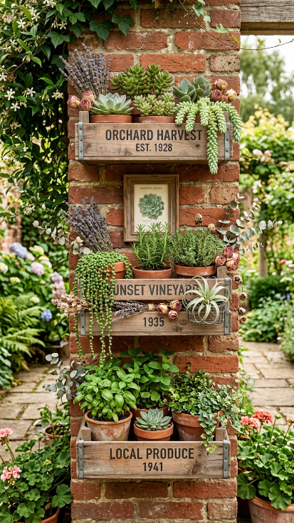 Vibe sentence: Vintage wooden crates turned wall shelves give a garden wall the layered, abundant character of a French market florist — personal, overflowing, and impossible to walk past without stopping.