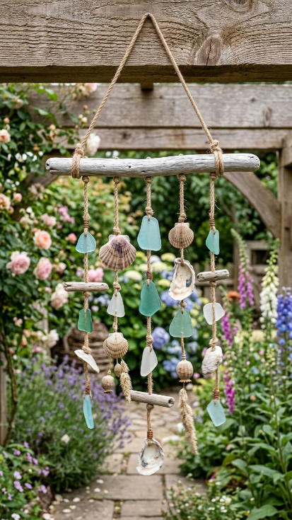 What makes it work: The visual appeal of a handmade wind chime lies in its layered transparency — looking through multiple hanging strands of sea glass, shells, and dried seed heads creates a depth and shimmer that shifts constantly with light and movement. Natural rope and driftwood keep the piece firmly in the rustic aesthetic, while sea glass adds a softly refined color note that elevates it beyond pure craft project.