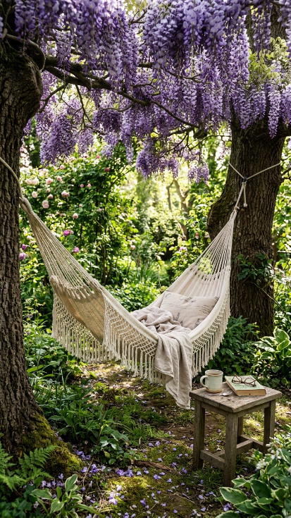 How to achieve it: Hang a hammock between two mature trees at least 12–15 feet apart using tree-safe suspension straps (flat webbing rather than rope, to protect bark). Choose a natural cotton or recycled cotton hammock in undyed cream or warm stripe — both work beautifully in a rustic garden palette. Train wisteria on a nearby pergola or wall rather than directly on tree trunks, as wisteria can damage and eventually strangle supporting trees over time.