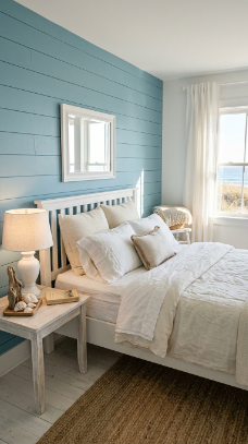 A soft ocean blue shiplap wall behind the bed brings the coast inside with gentle, faded-by-sun color that feels completely at home.