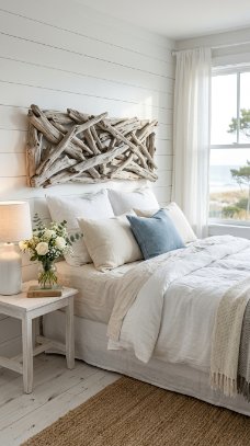 A sculptural driftwood headboard brings the beach directly into the bedroom with raw, sun-bleached coastal farmhouse beauty.