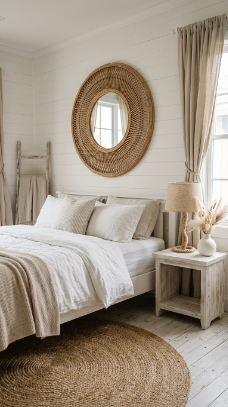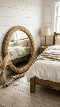 A large mirror with a thick nautical rope frame or rope-wrapped edge is a beautifully understated coastal farmhouse bedroom accent.