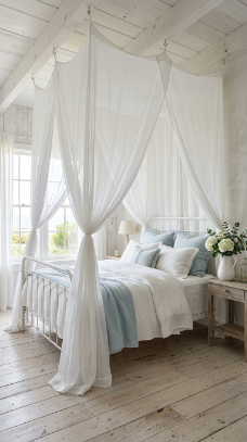 Sheer white or natural linen panels hung from the ceiling as a soft canopy above the bed create the most dreamy coastal farmhouse sleeping sanctuary.