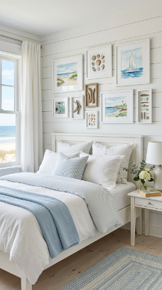 A bedroom gallery wall of watercolor coastal prints, shell photography and driftwood art frames in white and natural wood is casual coastal farmhouse curation at its best.