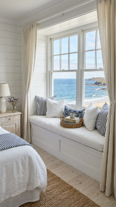 A deep built-in window seat with a thick cushion and the suggestion of an ocean view beyond makes this coastal farmhouse bedroom endlessly aspirational.