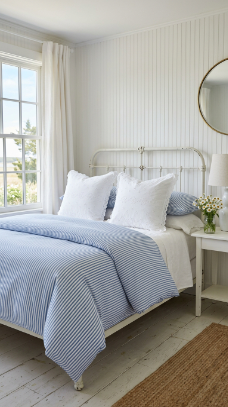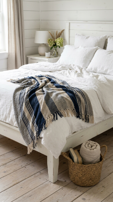 A casually draped navy and white or blue and natural linen stripe throw across the foot of a white bed is the simplest coastal farmhouse bedroom styling trick.