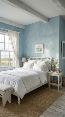 Soft blue limewash painted walls in a coastal farmhouse bedroom create a beautifully textured, almost watercolor effect that feels like the sea itself.