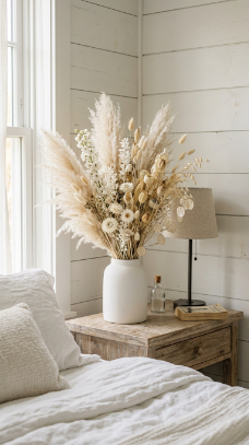 Dried coastal grasses, bleached pampas, white dried flowers and natural seed pods arranged in a white or natural ceramic vase is effortless coastal farmhouse bedside styling.
