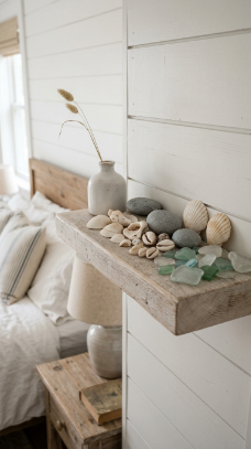 A curated collection of found shells, smooth stones and sea glass displayed on a bedside table or shelf brings genuine coastal farmhouse story and beauty indoors.