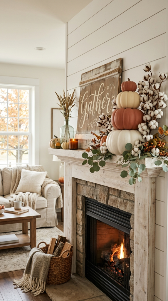 A cascading tower of white, cream, and terracotta pumpkins anchors your mantle with effortless charm — layered with dried cotton stems and a wooden sign.