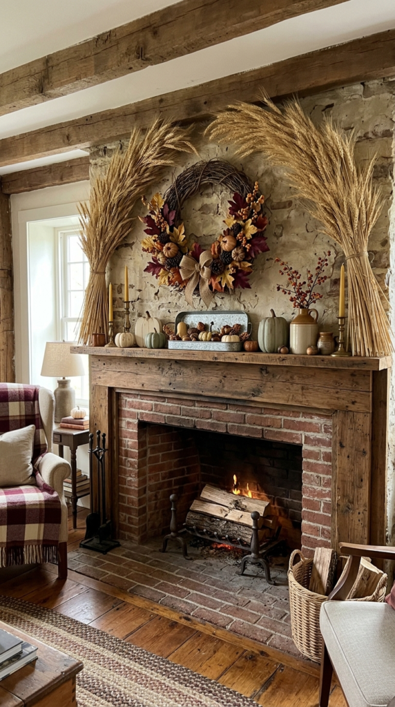 Hang a large grapevine wreath adorned with dried fall botanicals — wheat, small sunflowers, burgundy leaves, and a simple twine bow — above your mantle. Then lean two generous bundles of dried wheat against the wall on either side, letting them arch naturally outward. Below on the mantle surface, continue the wheat theme with a low arrangement of beeswax candles, small wooden pumpkins, and a galvanized metal tray. This is deeply nostalgic, pastoral, and warm — it feels like a farmhouse somewhere in the countryside just before harvest.