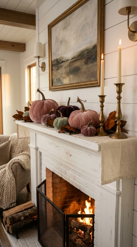 This idea pushes farmhouse decor into elevated, sophisticated territory. Source or craft velvet pumpkins in muted, jewel-toned hues — dusty rose, plum, sage, and deep burgundy — and arrange them around a pair of tall brass or antique gold candlesticks holding cream taper candles. Add a few loose dried magnolia leaves and a simple linen table runner across the mantle surface. This look is quiet, artistic, and deeply intentional. It suits those who want fall decor that doesn’t scream Halloween but whispers something beautifully autumnal.