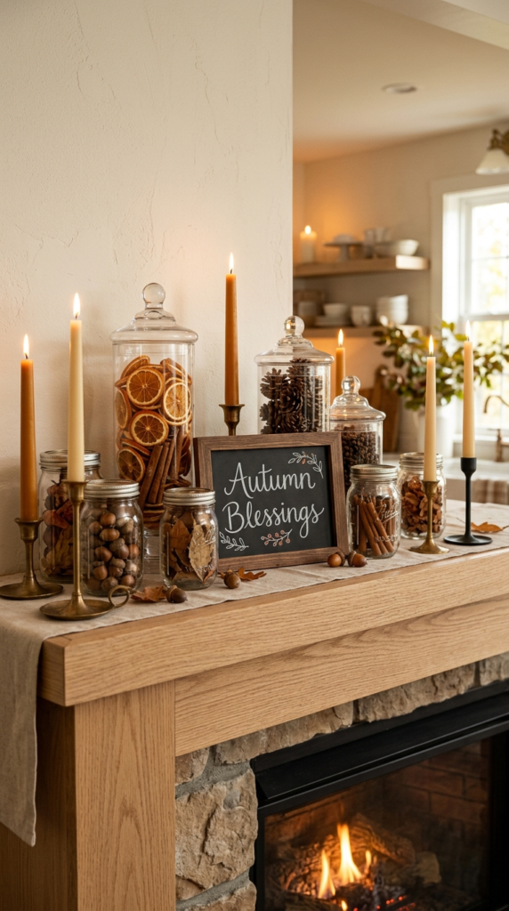 This idea is charming, budget-friendly, and completely customizable. Line up four to six glass apothecary jars or mason jars of varying sizes along the mantle surface and fill each one with a different natural fall element. Acorns in one, dried orange wheel slices in another, cinnamon sticks bundled upright, whole cloves, or even mini pine cones. Add a few tapered candles in holders between the jars and a small chalkboard sign. It smells incredible and looks like something out of a Williams-Sonoma catalog.