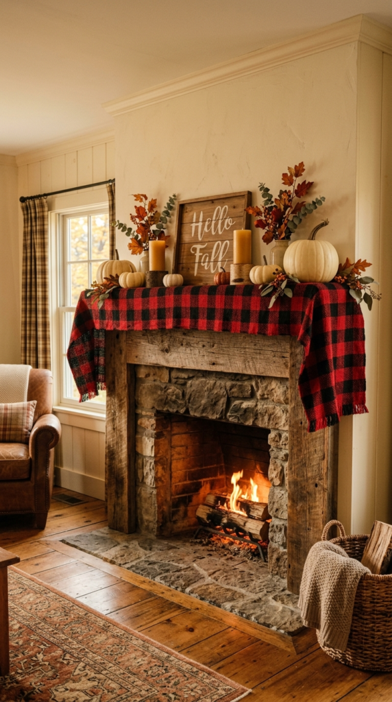 A cozy buffalo plaid or tartan wool scarf draped casually across the mantle shelf becomes the warmest, most inviting foundation for your entire fall display.