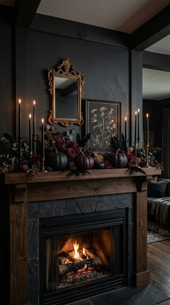 Deep, dramatic, and utterly gorgeous — this dark fall mantle features midnight black pumpkins, deep burgundy florals, and moody candlelight that transforms your fireplace into something otherworldly.