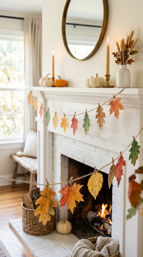 This idea is a DIY dream. Use watercolor paper to paint individual leaves in shades of burnt orange, golden yellow, deep red, and earthy brown, then punch small holes through the stems and thread them onto natural twine to create a garland. Hang it along the front edge of the mantle for a fluttering, artistic touch that no store-bought decor can replicate. Pair with simple white pumpkins and a neutral backdrop to let the garland be the star.