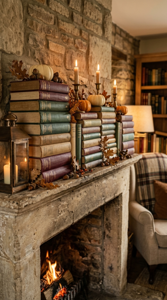 Gather old hardcover books with beautiful spines — preferably in autumn-toned colors like burgundy, hunter green, warm tan, and navy — and stack them in varying heights across the mantle. Top each stack with a small pumpkin, a cluster of acorns, or a simple taper candle in a holder. Between the stacks, add a few loose dried leaves and a small lantern or two. This look is deeply personal, intellectual, and endlessly charming.