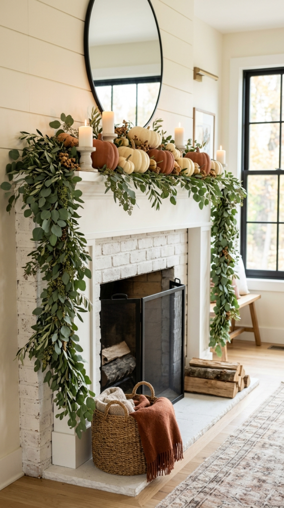 Buy or forage long stems of seeded or silver dollar eucalyptus and lay them across the full length of the mantle, allowing generous portions to cascade down either side. Nestle terracotta, white, and cream pumpkins of varied sizes throughout the greenery, and place three to five pillar candles in simple white holders among the arrangement. The combination of cool, silvery eucalyptus and warm earthy pumpkins is one of fall’s most beautiful contrasts.
