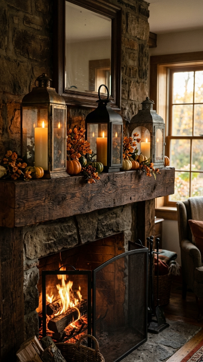 Collect three lanterns in varying heights and finishes — think aged bronze, matte black, and galvanized metal — and place pillar candles or LED flameless candles inside each one. Arrange them in a staggered row across the mantle, nestling dried orange blossom branches and mini gourds between them. The asymmetry is intentional and beautiful. This look thrives in homes that have darker, moody interiors or those who love the gothic edge of fall. It works equally well on a rustic wooden mantle or a sleek black slate surround.
