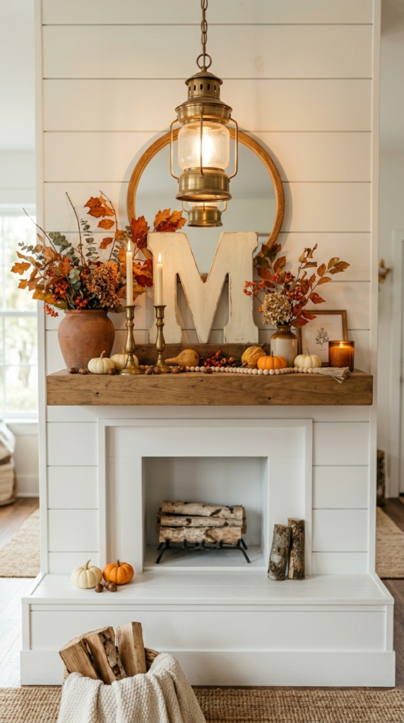 Choose your family’s initial in a large wooden letter — ideally twelve to sixteen inches tall — and center it on your mantle. Paint it in chalk white, deep hunter green, or warm terracotta and surround it with fall botanicals, a pair of candlesticks, and small decorative pumpkins. You can also wrap the letter in fall foliage or fairy lights for extra warmth. This idea makes the mantle feel deeply personal and specific to your family — something guests always notice and comment on.