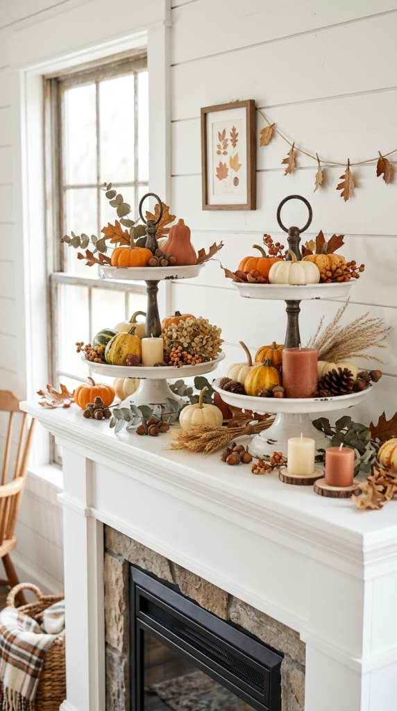 Tiered cake stands repurposed as elegant display platforms for miniature pumpkins, gourds, candles, and botanicals give your mantle a bakery-meets-harvest aesthetic.