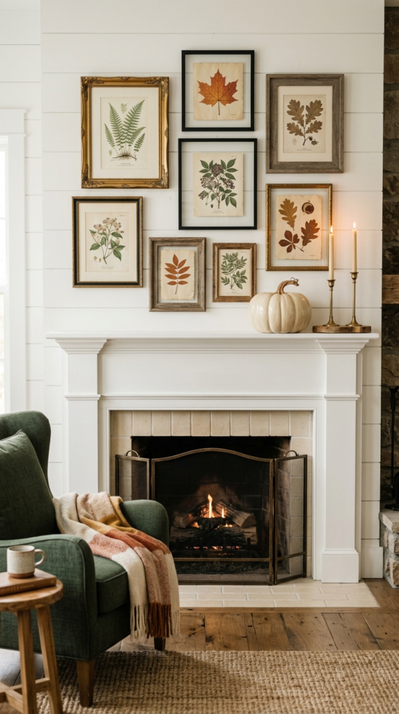 A curated gallery wall of vintage botanical prints and pressed autumn leaves in mismatched frames creates a sophisticated fall mantle backdrop that feels like a collected-over-decades work of art.