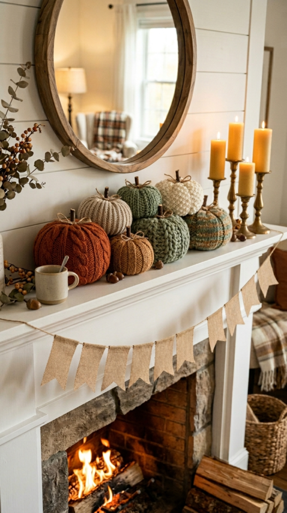 Cover pumpkins of various sizes with pieces cut from old sweaters or purchase knit-wrapped pumpkins and line them up in a staggered row across your mantle surface. The varied knit textures — cable knit, ribbed, chunky — give each pumpkin its own personality while the cohesive color story ties them all together. Add a simple banner garland and a few beeswax candles to finish the look.