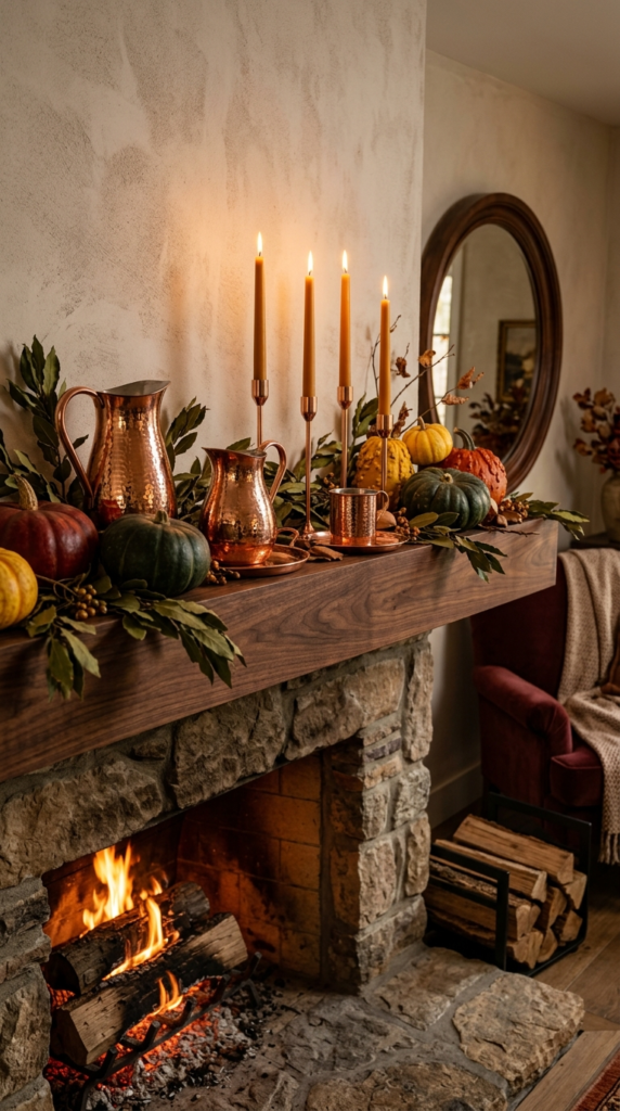 Gleaming copper vessels, candlesticks, and bowls paired with jewel-toned heirloom pumpkins create a fall mantle that shimmers with warmth and feels genuinely luxurious.
