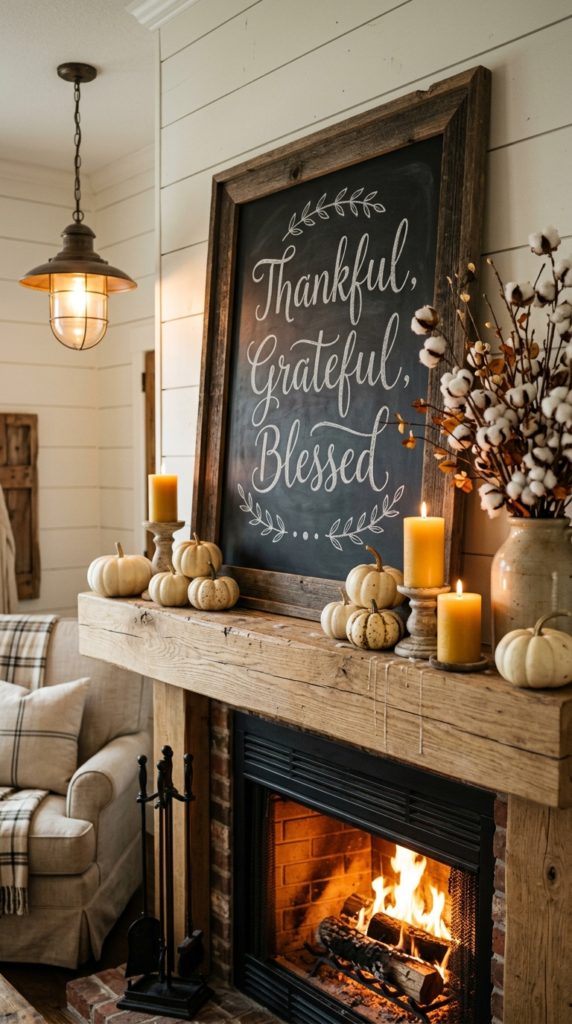 A large vintage-style chalkboard leaning on the mantle with a beautifully lettered fall quote becomes the emotional anchor of your entire seasonal display.