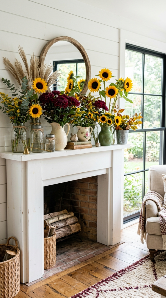 Sunflowers are the bridge between summer and fall — and they are absolutely spectacular on a mantle. Fill four to six mason jars and vintage vessels of different heights with freshly cut or high-quality faux sunflowers and arrange them in a loose, abundant cluster across the mantle. Mix in a few stems of burgundy mums and dried grasses for a more complex floral story. This is joyful, generous, and full of life.