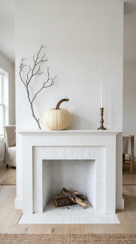 Just three perfectly chosen elements — a single large white pumpkin, one architectural branch, and one white taper candle — create a fall mantle so serene it feels like a meditation.