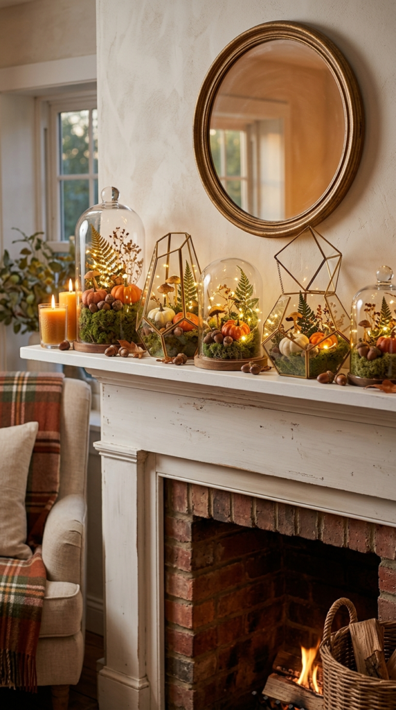 Place three to five glass terrariums — open geometric shapes, bell jars, or vintage cloches — across the mantle surface and create tiny curated worlds inside each one. Use preserved or live moss as a base, then add miniature pumpkins, acorns, small mushroom figurines, and snippets of fall ferns or foliage. Each terrarium tells its own small story. The overall effect is magical, whimsical, and deeply original.
