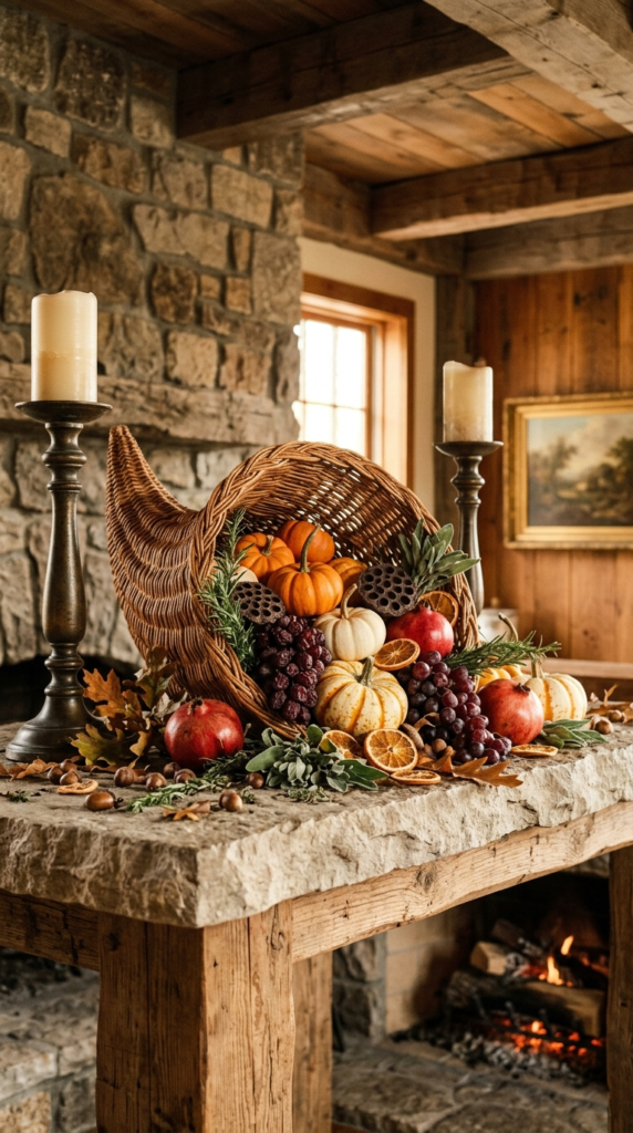 The cornucopia is one of fall’s oldest and most meaningful symbols, and when styled with intention it is absolutely breathtaking on a mantle. Place a large woven wicker cornucopia slightly left of center and let its contents spill generously outward — mini pumpkins, dried grape clusters, deep red pomegranates, dried orange slices, lotus pods, and sprigs of rosemary and sage. Frame it with two matching candlesticks and let it dominate the space.