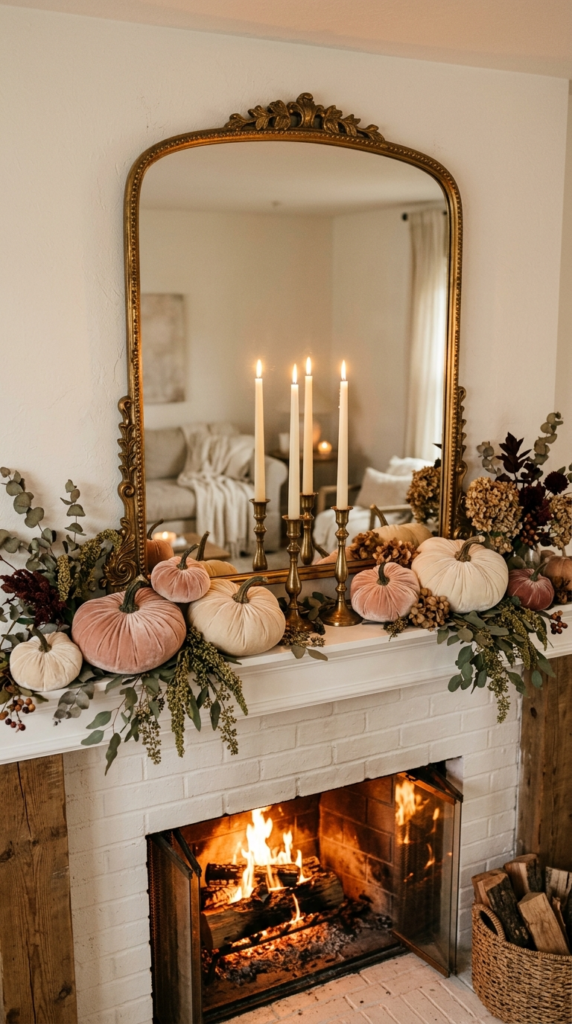 This is the decorator’s ultimate trick. Hang or lean a large vintage mirror with an ornate, antique-gold or weathered-wood frame above the mantle and watch it transform every single thing in front of it. The reflection creates depth, bounces light, and makes even a simple arrangement of pumpkins and candles look like it belongs in Architectural Digest. Style the mantle below with your favorite fall elements — a mix of velvet pumpkins, taper candles, and a dried floral arrangement — and let the mirror do the rest of the magic.