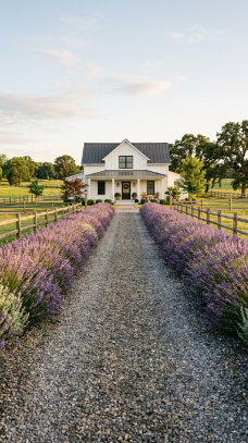 A classic gravel driveway flanked by long rows of lavender is the most timeless farmhouse arrival experience.