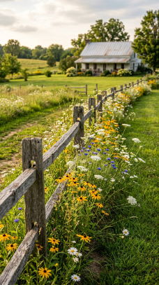 A rustic split-rail fence with wildflowers growing freely along its length looks perfectly, beautifully undone.