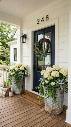A pair of large statement planters overflowing with seasonal blooms on either side of the door creates an instant welcoming entrance.