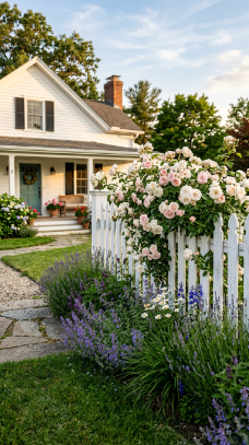 A white picket fence draped in climbing roses is the single most iconic image of farmhouse curb appeal.
