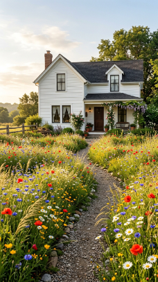 Replacing a traditional lawn with a wildflower meadow gives a farmhouse the most breathtaking natural curb appeal.