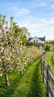 A row of dwarf apple trees along the property boundary is a productive and incredibly beautiful farmhouse landscape feature.