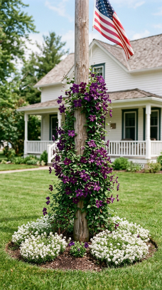 A wooden or metal flagpole with a flowering vine climbing its base becomes a charming vertical farmhouse landscape moment.